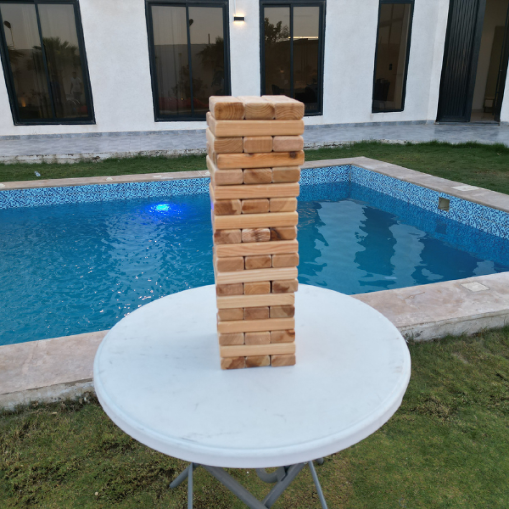 لعبة جينجا العملاقة لعبة تنافسة بين عدة اشخاص يتم سحب قطعة واحدة من قبل كل لاعب بالترتيب